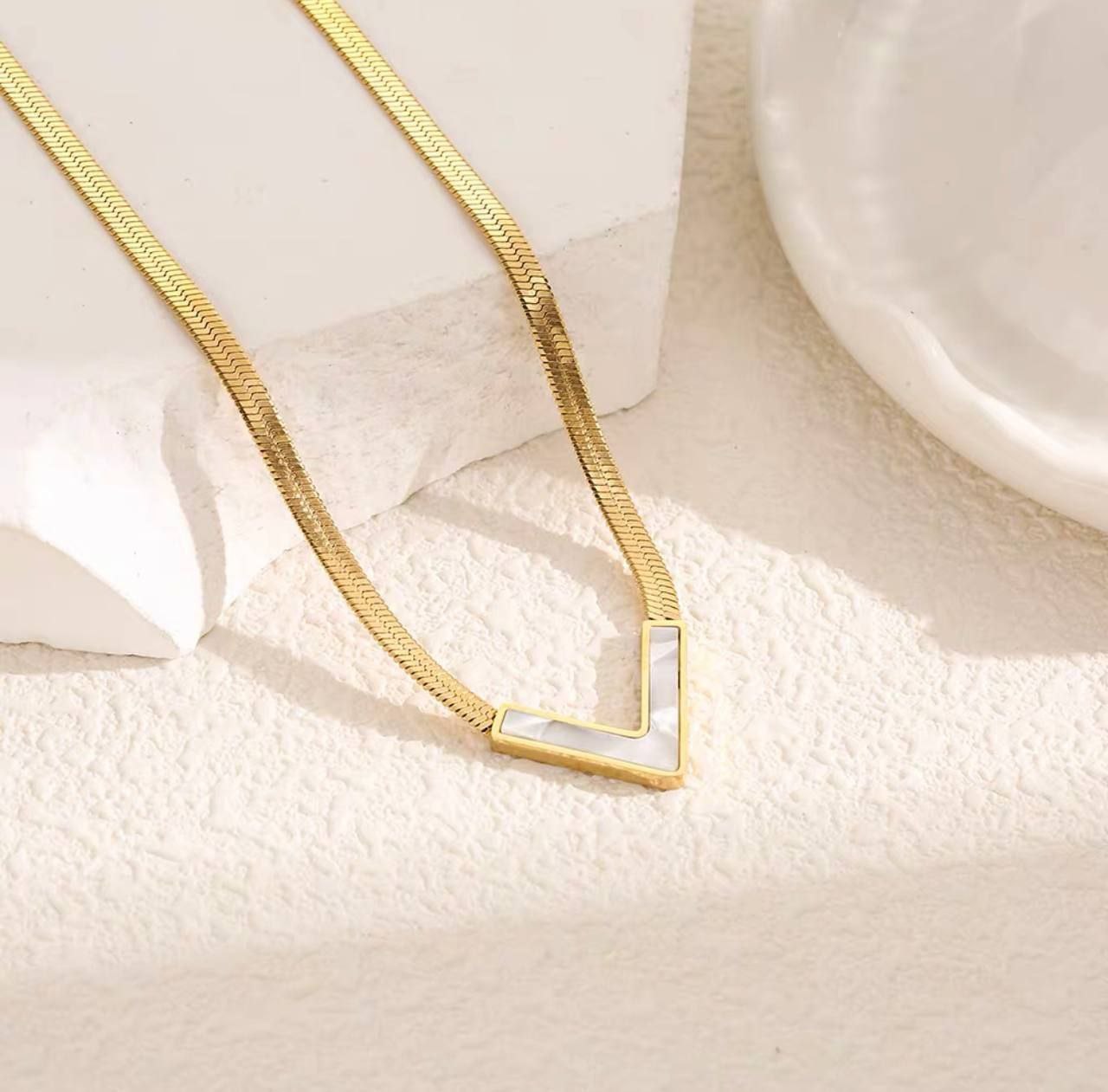 Elegant V-shaped necklace crafted from shiny gold-tone metal with a smooth enamel center. Its minimalist yet luxurious design makes it perfect for both casual and formal looks. A timeless piece that adds a touch of sophistication to any outfit.